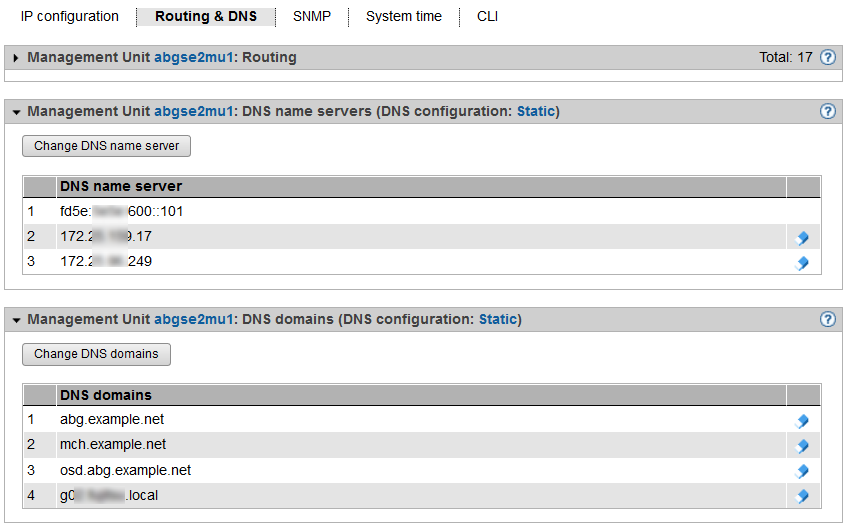 You manage the DNS configuration of the Management Unit using the associated Management menu, Routing & DNS tab.