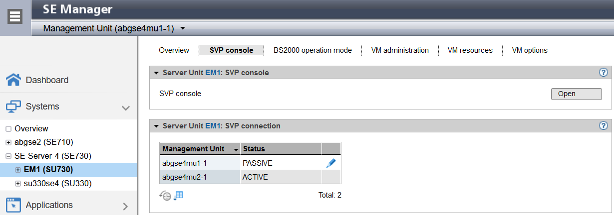 > | Click Open in the SVP console group to open a window with the SVP console. Information on console access can also be obtained in the SE Manager’s help. |
