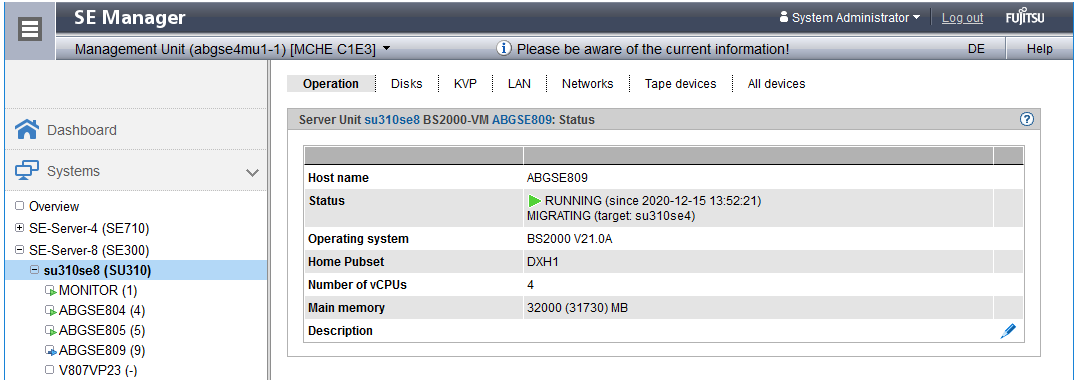 In the status field, “MIGRATING” is shown as sub-status to the current status as well as the target SU. - Main window with system overviews for example “VM administration”