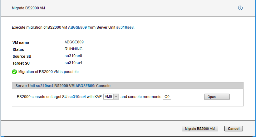 The action or the wizard “Migrate BS2000” is only offered when the SU is a part of an SU Cluster and an LM is possible in principle.