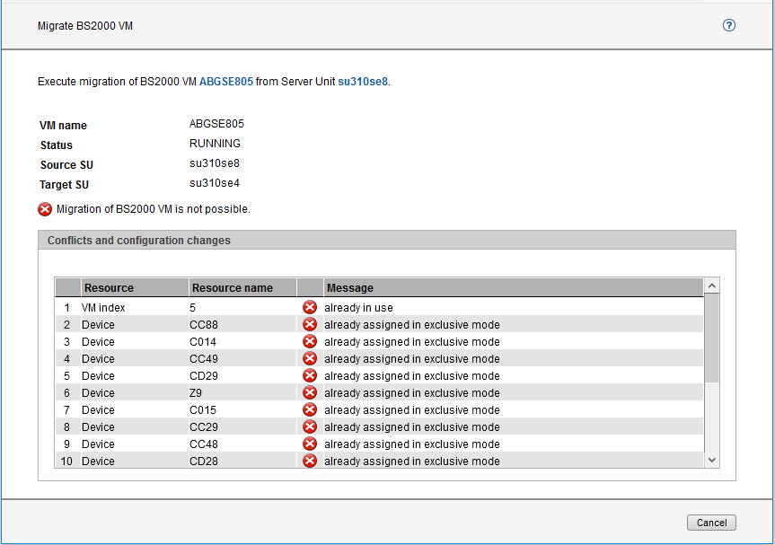 It is checked if the resources and prerequisites needed for the BS2000 system to be migrated are fulfilled on the target SU (devices, size of the needed main memory, free VM index, etc. See chapter -> Usage scenarios and preconditions for LM). The discovered issues or conflicts are reported directly to the caller in the wizard.