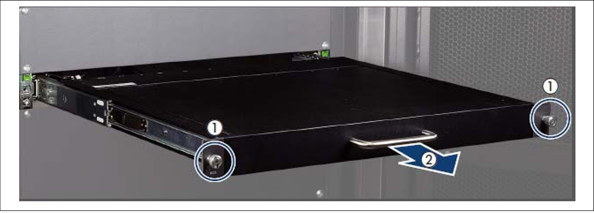 > | Pull the rack console while you hold the handle (2) until it locks into place. |