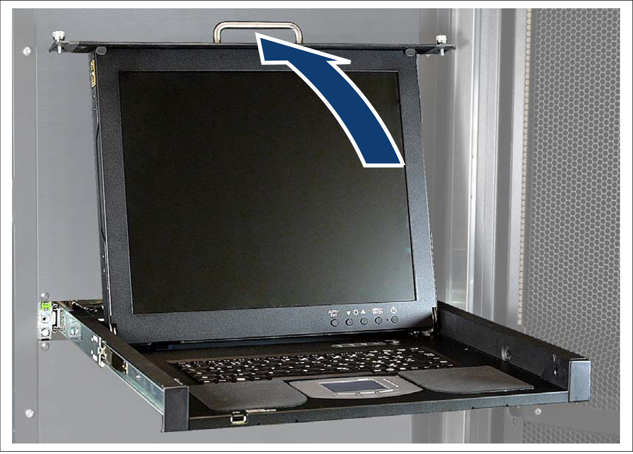 > | Use the handle to push the cover of the rack console up until the monitor is open at an angle of 110 degrees. |
