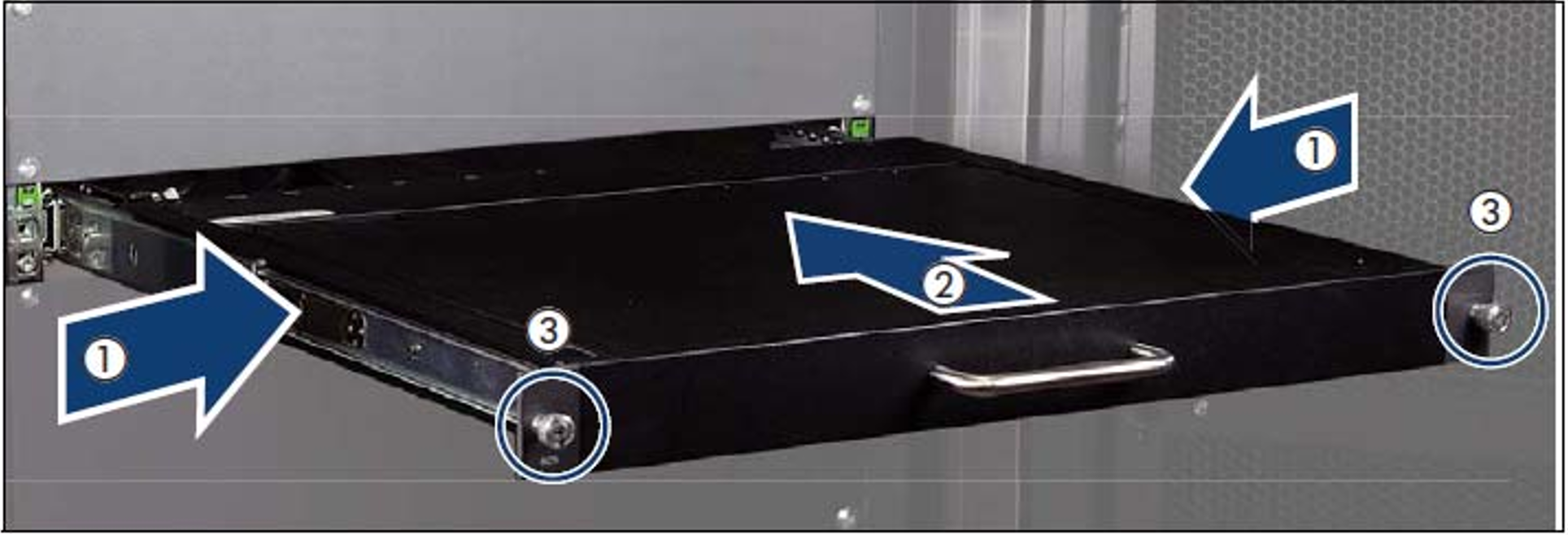 > | Use the handle to slide the rack console into the rack until it clicks into place (2). |