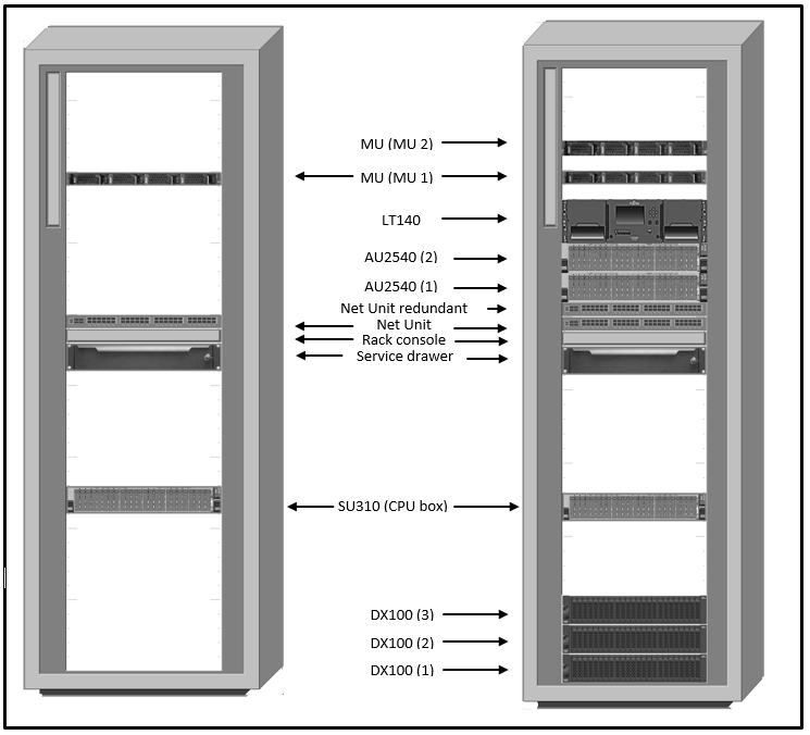 The following figure shows examplarily how the basic rack of the SE servers SE310, SE320 resp. SE330 / SE330B is equipped with the components of the basic configuration and with optional components.