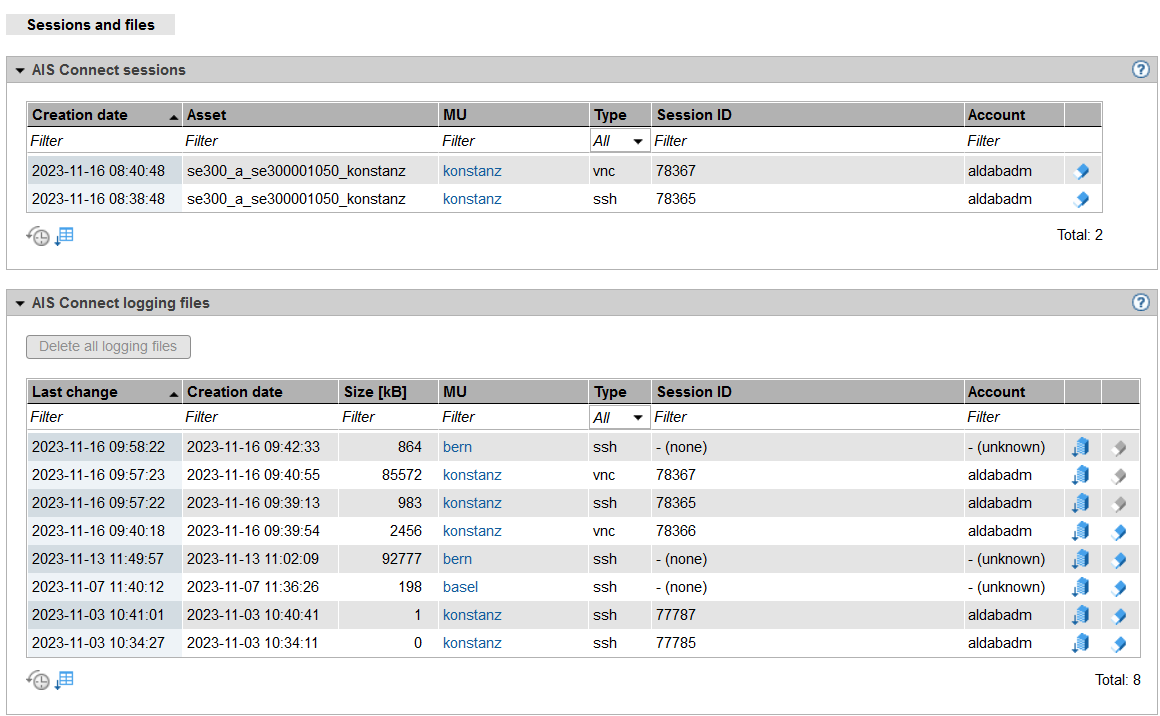 > | In the tree structure select Service -> Remote service sessions. The Sessions and files tab opens. The AIS Connect sessions table displays the currently active sessions. As an administrator or security administrator you can delete a session by clicking the Delete () icon for the required session.