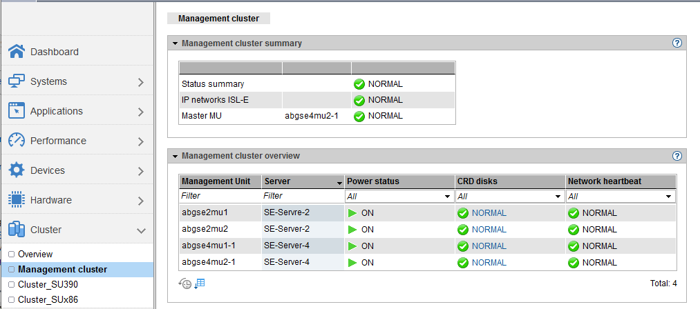 - Master MU: name of the Management Unit which acts as -> Master MU currently in the Management Cluster, and the status of the internal resources of the Master MU.