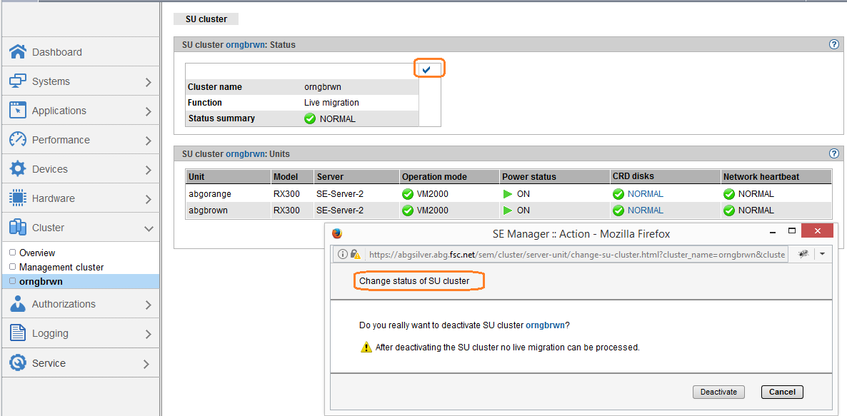 Example of an SU x86 Cluster within an SE Server and the dialog for deactivating the SU Cluster: