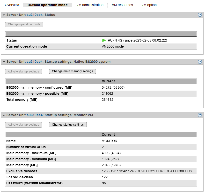 If the devices of the monitor VM are assigned or removed using the VM specific tabs Disks, KVP, LAN, Tape devices or All devices, the changes only remain active until the BS2000 operation mode is reset or until the SU is restarted. The same applies for changes of the device configuration done via VM2000 commands that refer to the monitor VM.