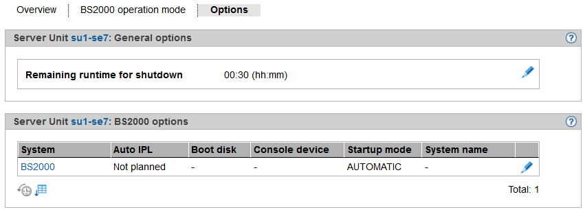 For SU x86, you manage the options using the Options tab of the BS2000 system. You can change the settings for the shutdown, the startup and the Auto IPL.