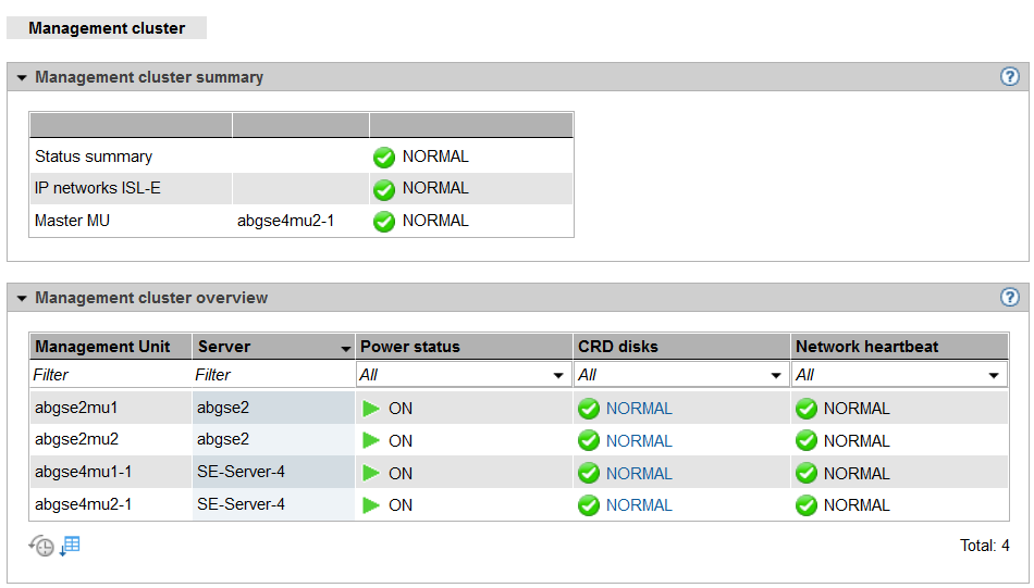 If an SE server configuration consists of two or more SE servers, the SE servers are managed together in a shared Management cluster. The main window provides information on the central resources of the Management cluster and their status, as well as on the overall status of the Management cluster.