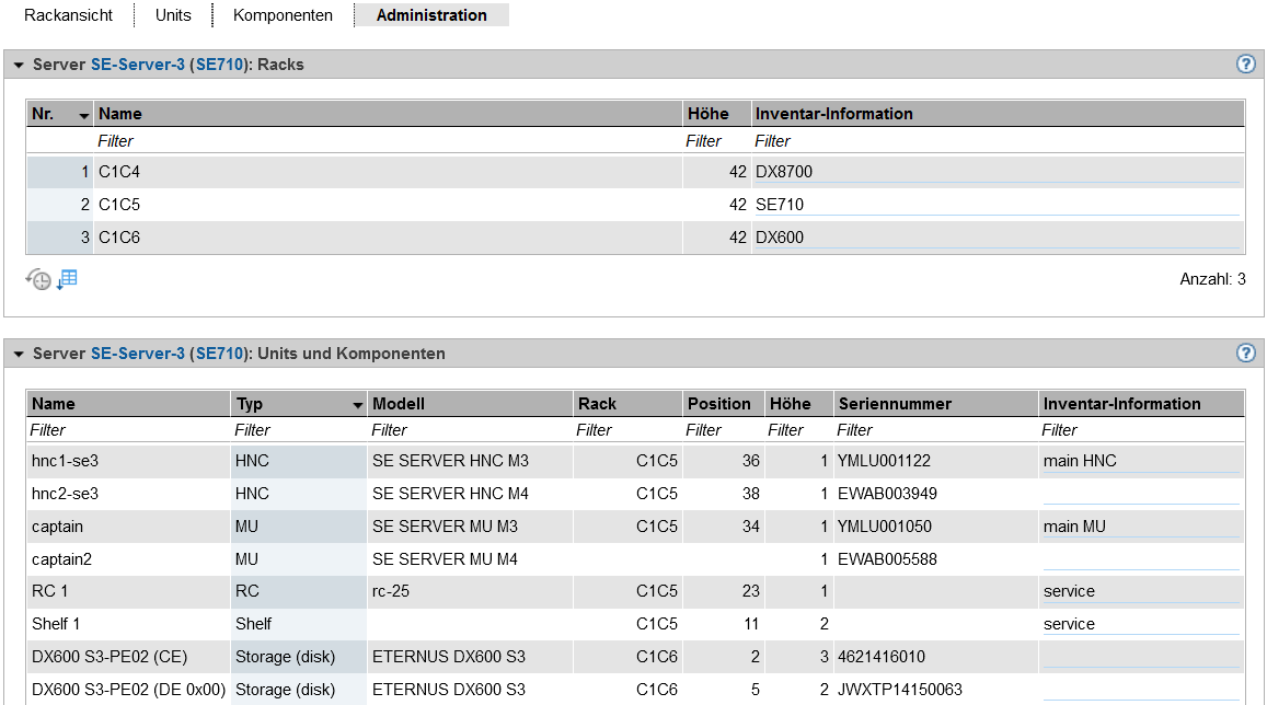 In der Administration-Ansicht werden alle Racks und Hardwarekomponenten in Tabellenform angezeigt. Für Racks und andere Hardwarekomponenten wird je eine Gruppe ausgegeben.