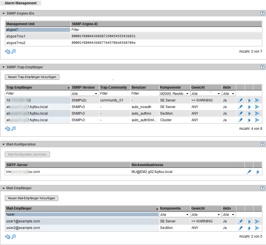 Die Registerkarte Alarm Management zeigt Informationen über die Empfänger von Benachrichtigungen per SNMP-Trap, die Mail-Konfiguration und die Empfänger von Benachrichtigungen per Mail.