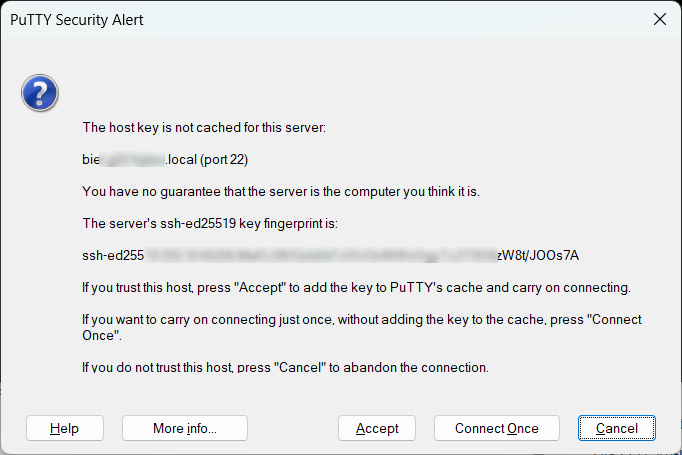 Bei der ersten Verbindungsaufnahme müssen Sie (je nach SSH-Client) diesen Host-Schlüssel ggf. wie im nachfolgenden Beispiel mit PuTTY bestätigen.