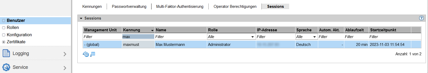 Anzeige der globalen Session (siehe die erste Spalte) für die (eigene, blau markierte) Kennung maxmust