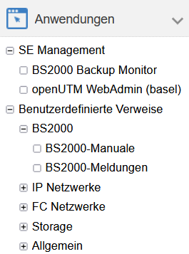 Sie verwalten Anwendungen über das Menü Anwendungen in der Primärnavigation. Dabei wird zwischen SE Management-Anwendungen und benutzerdefinierten Verweisen unterschieden.