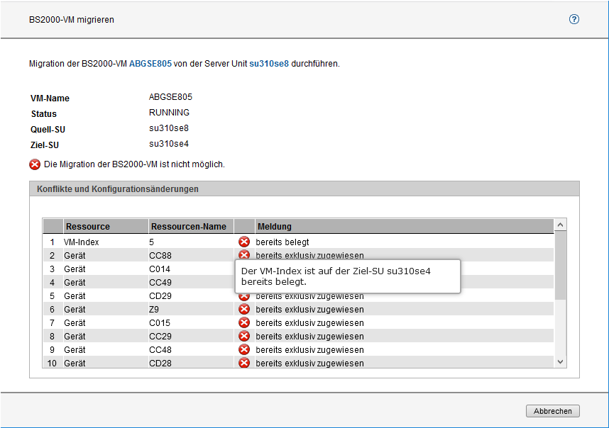 Es wird geprüft, ob an der Ziel-SU die für das zu migrierende BS2000-System notwendigen Ressourcen gegeben sind (Geräte, Größe des benötigten Hauptspeichers, freier VM-Index usw. - siehe Kapitel -> Einsatzszenarien und Voraussetzungen für LM), festgestellte Probleme bzw. Konflikte werden dem Aufrufer direkt im Wizard gemeldet.