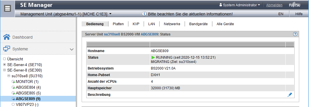 Sobald der Wizard nach einer erfolgreichen Migration geschlossen wird, leitet der SE Manager automatisch auf das Hauptfenster "Bedienung" der migrierten VM auf der Ziel-SU weiter.