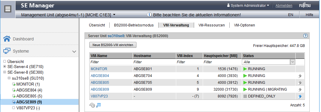 Im Status-Feld werden "MIGRATING" als Substatus zum aktuellen Status sowie die Ziel-SU angezeigt. - Hauptfenster mit System-Übersichten, z.B. "VM-Verwaltung"
