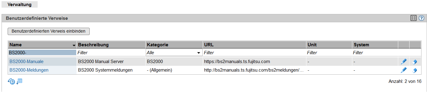 > | Wählen Sie Anwendungen -> Benutzerdefinierte Verweise, Registerkarte Verwaltung. Die Registerkarte Verwaltung zeigt in der Gruppe Benutzerdefinierte Verweise die Liste der benutzerdefinierten Verweise, |