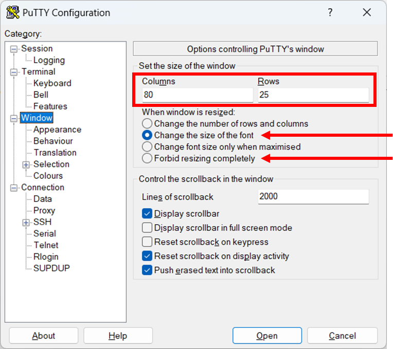 > | Achten Sie darauf, dass eine Fenstergröße von 80 Spalten und 25 Zeilen eingestellt ist. Eine Veränderung der Anzahl von Zeilen und Spalten durch das Ziehen des Dialogfensters muss verhindert werden, da sonst die Darstellung zerstört wird. Wählen Sie dafür eine der folgenden Einstellungen für die Fenstergröße:
