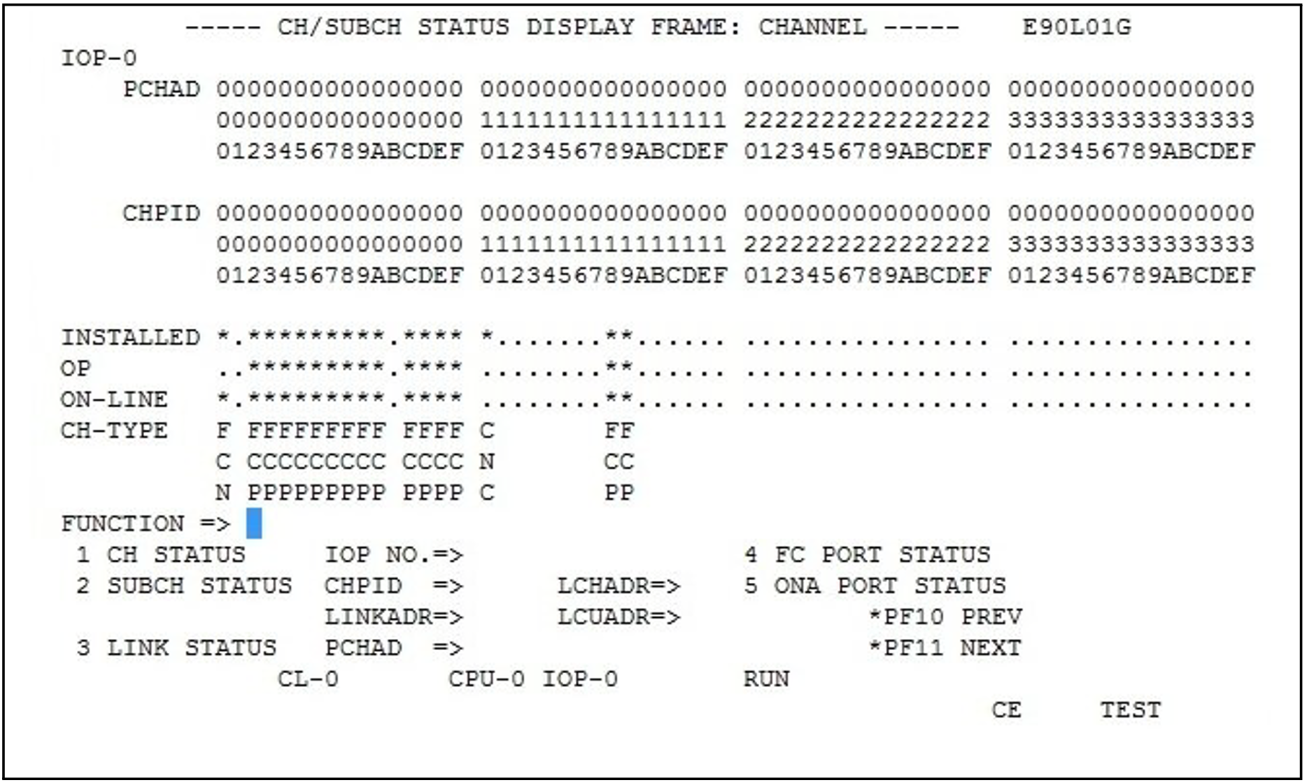 Wenn Sie die Eingabefelder ausfüllen und die Taste ENTER drücken, wird der Status des Ein-/Ausgabesystems angezeigt. In Verbindung mit FUNCTION 2 bis 5 werden weitere Subframes geliefert.