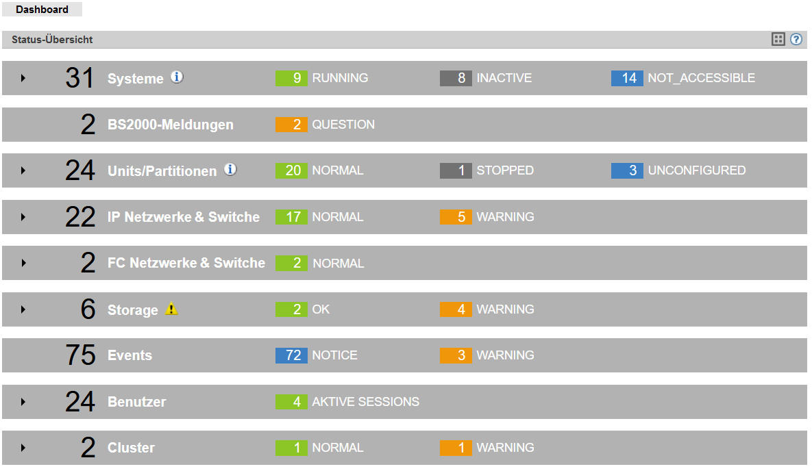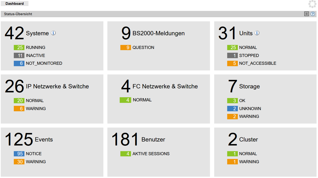 > | Wählen Sie in der Primärnavigation Dashboard. Die Registerkarte Dashboard mit der Gruppe Status-Übersicht öffnet sich. Sie ermöglicht auf einen Blick zu sehen, ob irgendwo ein Problem vorhanden ist. |