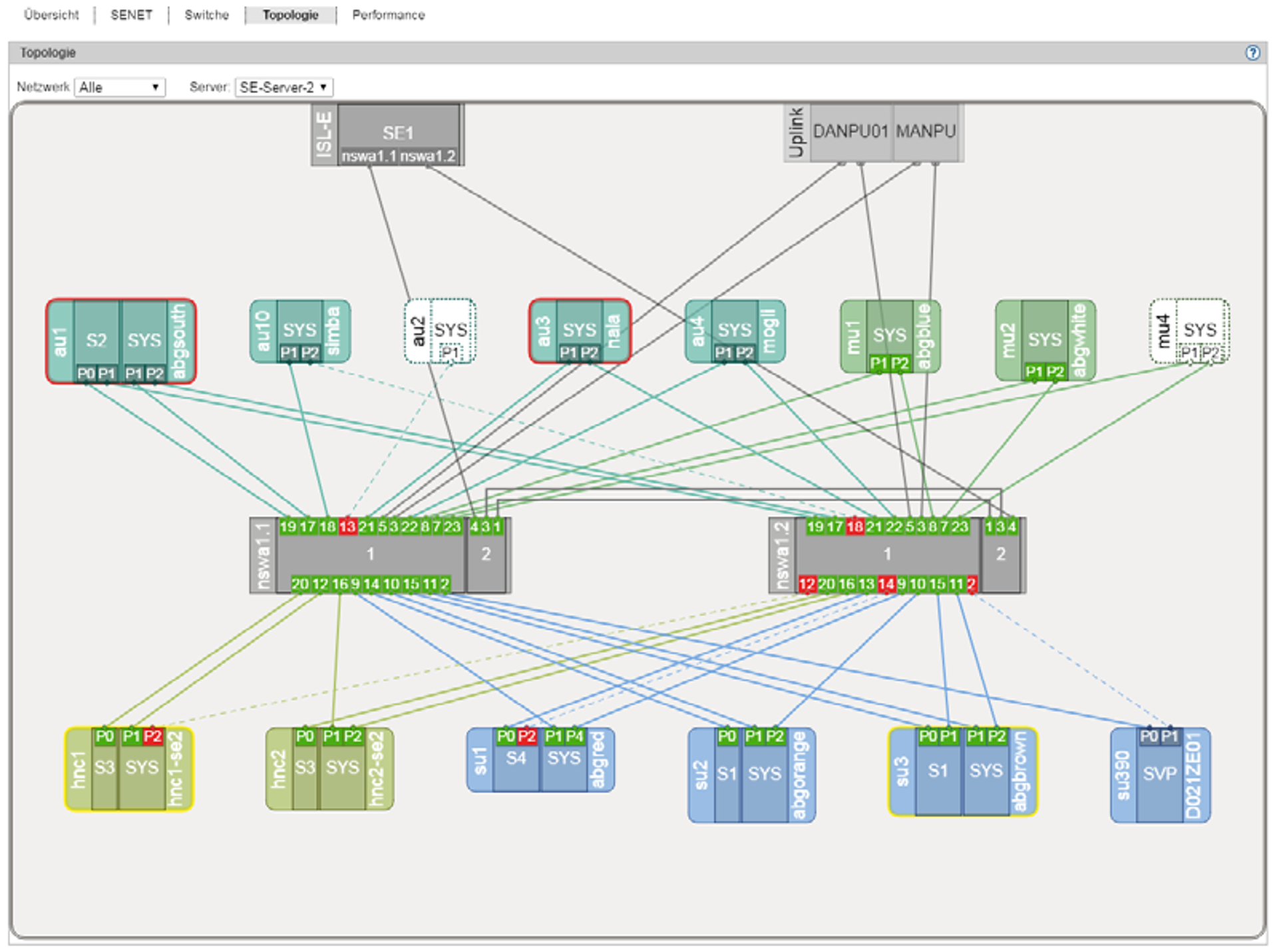 Bei einem Management Cluster können Sie aus der Liste Server den SE Server auswählen, dessen Netzwerk-Topologie angezeigt werden soll. Voreingestellt ist der SE Server der lokalen MU.