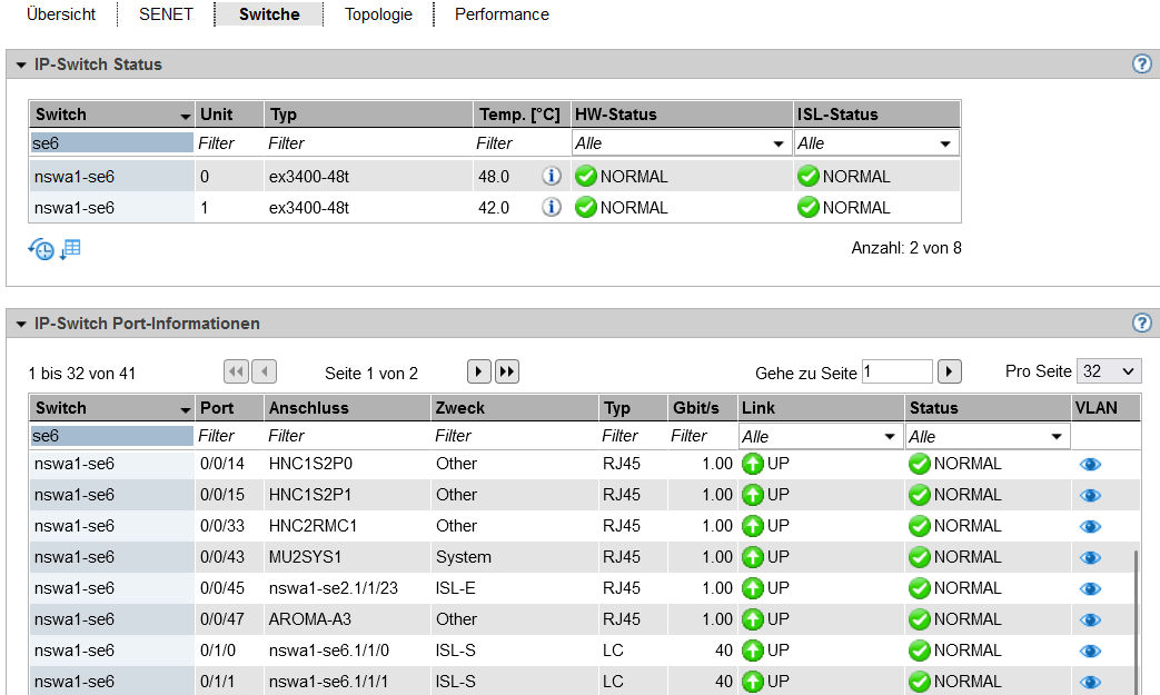 Die Registerkarte Switche zeigt den Status der Switche und Informationen zu den Ports an.