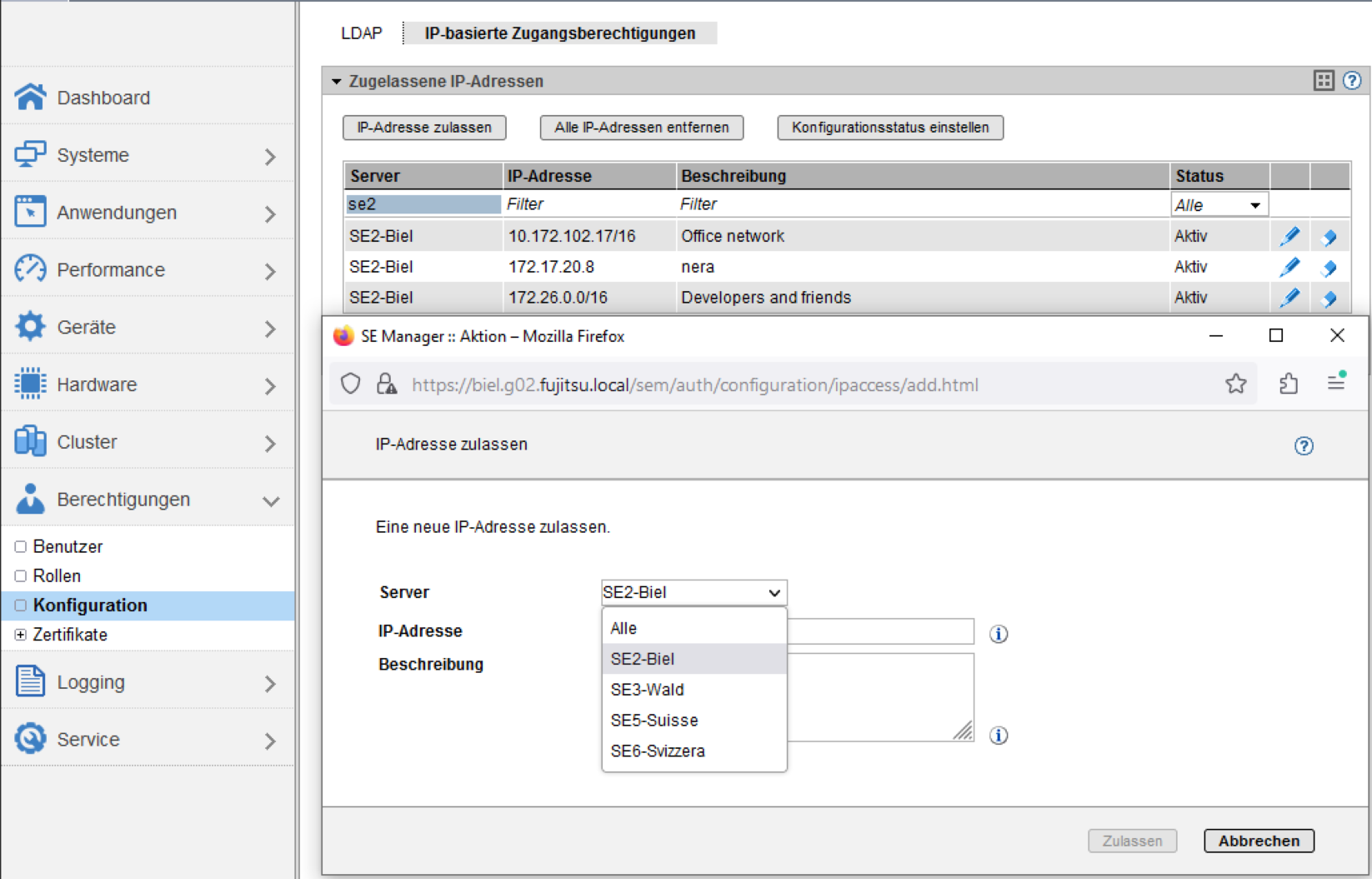 Der übergeordnete Dialog „IP-Adresse zulassen" bietet auch die Komfortfunktion, Einträge für alle SE Server gleichzeitig durchzuführen und somit alle SE Server gemeinsam zu verwalten. Auch die anderen übergeordneten Dialoge können serverspezifisch oder für alle Server gleichzeitig durchgeführt werden.