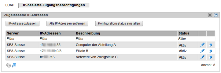Die Registerkarte IP-basierte Zugangsberechtigungen zeigt an, für welche IP-Adressen und Netzwerke der Zugang zu den MUs des SE Servers zugelassen ist.
