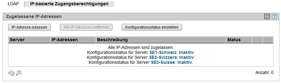Standardmäßig ist die Liste für die Zugangsbeschränkungen leer und der Zugang ist unbeschränkt für alle IP-Adressen und Netzwerke zugelassen: