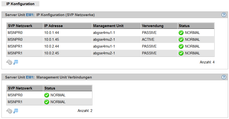 Die IP Konfiguration der SU /390 wird über das zugehörige Menü Management angezeigt. Die Registerkarte IP Konfiguration zeigt Informationen über SVP-Netzwerke und Verbindungen an: