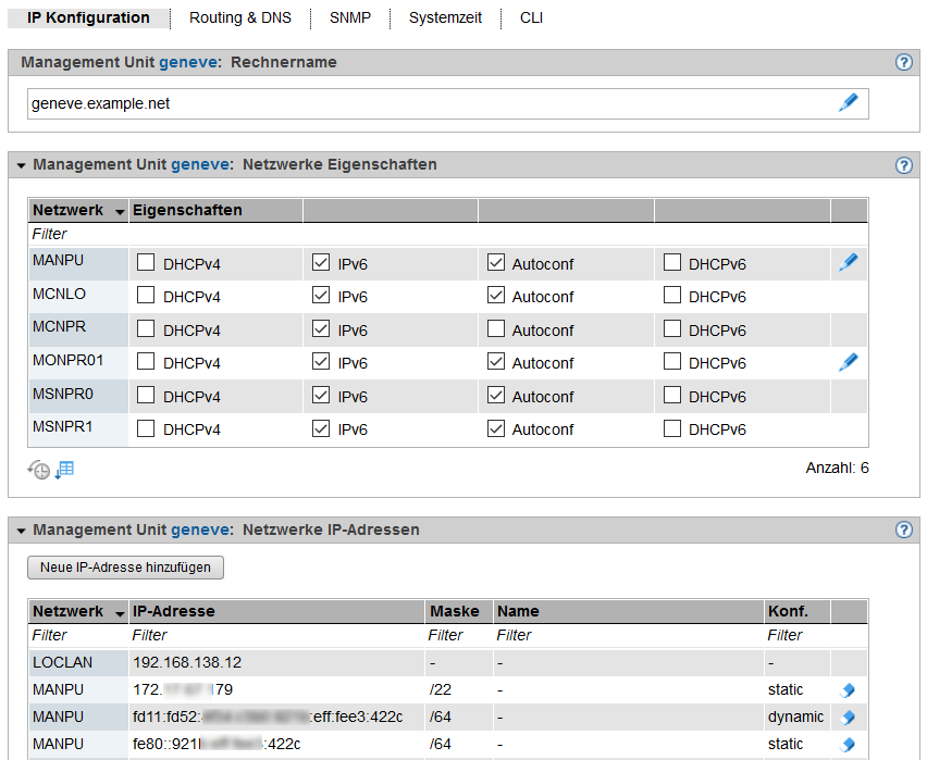 Die IP Konfiguration der Management Unit verwalten Sie über das zugehörige Menü Management, Registerkarte IP Konfiguration.