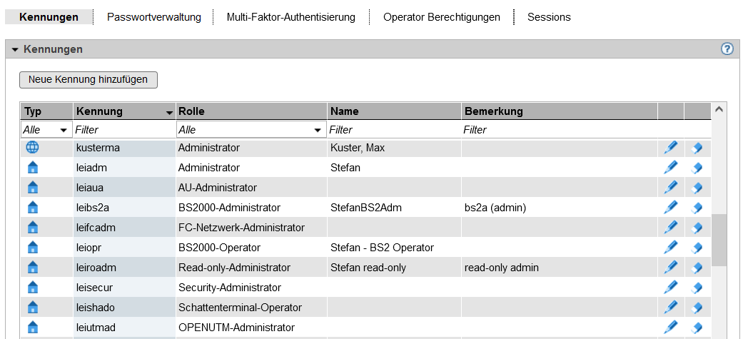 Als Administrator oder Security-Administrator können Sie weitere Kennungen mit einer Basis-Rolle bzw. einer benutzerdefinierten Rolle anlegen, ändern und löschen. Die Kennung service (Rolle Service) können Sie nicht administrieren.