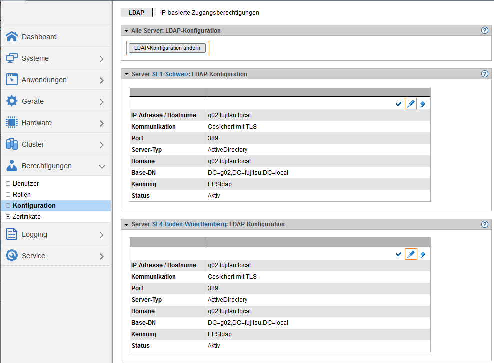 Der übergeordnete Dialog „LDAP-Konfiguration ändern" (Schaltfläche oberhalb der Tabelle) bietet auch die Komfortfunktion, alle SE Server gemeinsam zu verwalten und sie gleich zu konfigurieren.
