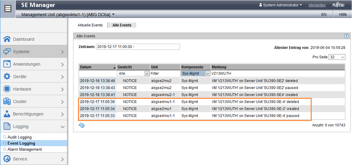 Im Falle einer LM zwischen SU x86 werden vier Events erzeugt - die VM wird vor dem Löschen noch deaktiviert - ansonsten sind die Anzeigen gleich.