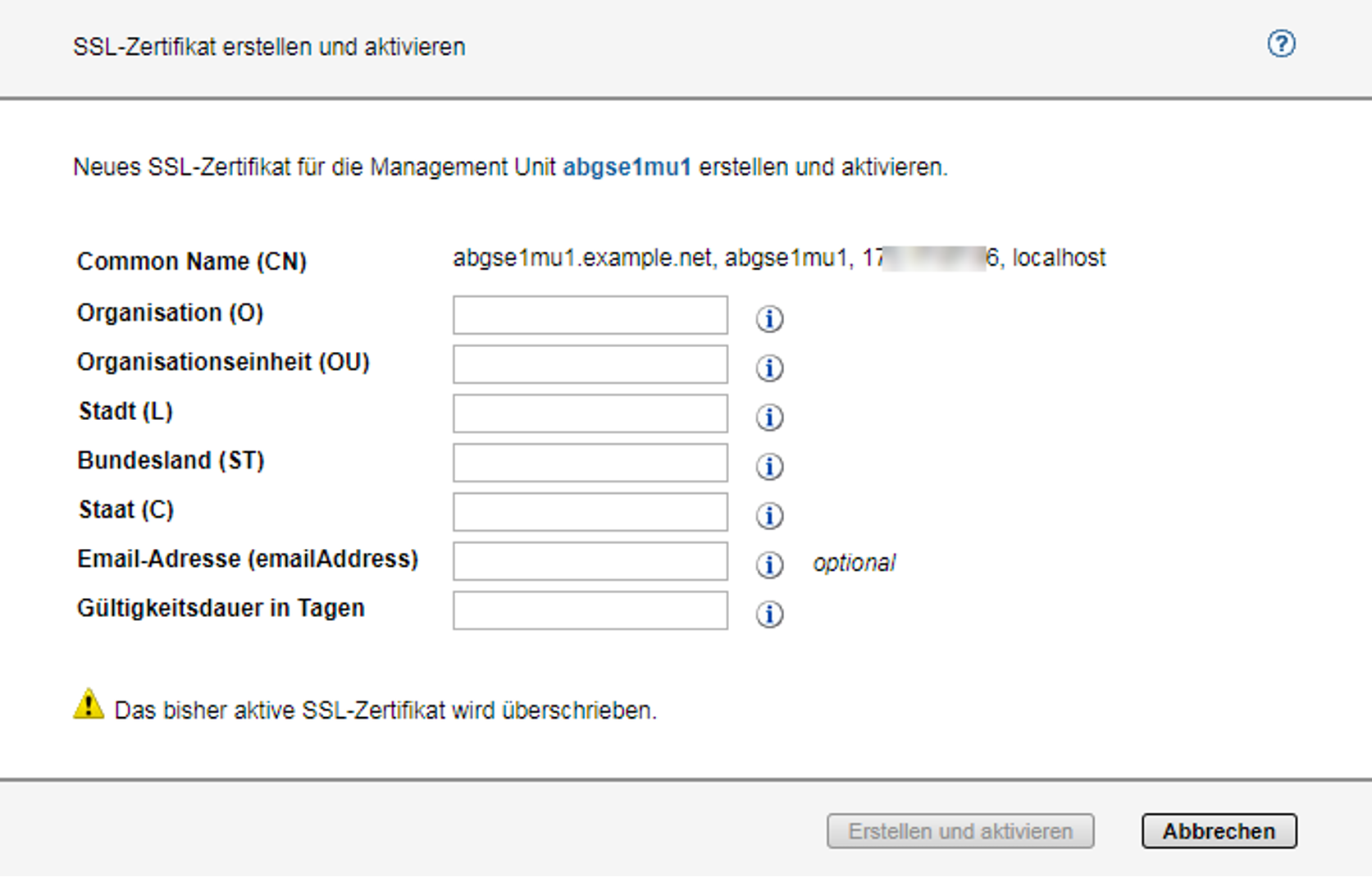 > | Klicken Sie Neues SSL-Zertifikat erstellen und aktivieren oberhalb der Tabelle. Es wird ein Dialog geöffnet: Tragen Sie die wesentlichen Daten des Zertifikats ein. Der Wert für den Common Name (CN) ist fest vorgegeben und beinhaltet den vollqualifizierten Domänennamen (FQDN) des Systems. Informationen zu den Attributen Organisation (O), Organisationseinheit (OU), Stadt (L), Bundesland (ST), Staat (C), Email-Adresse (emailAddress), Gültigkeitsdauer in Tagen finden Sie in der Online-Hilfe. |
