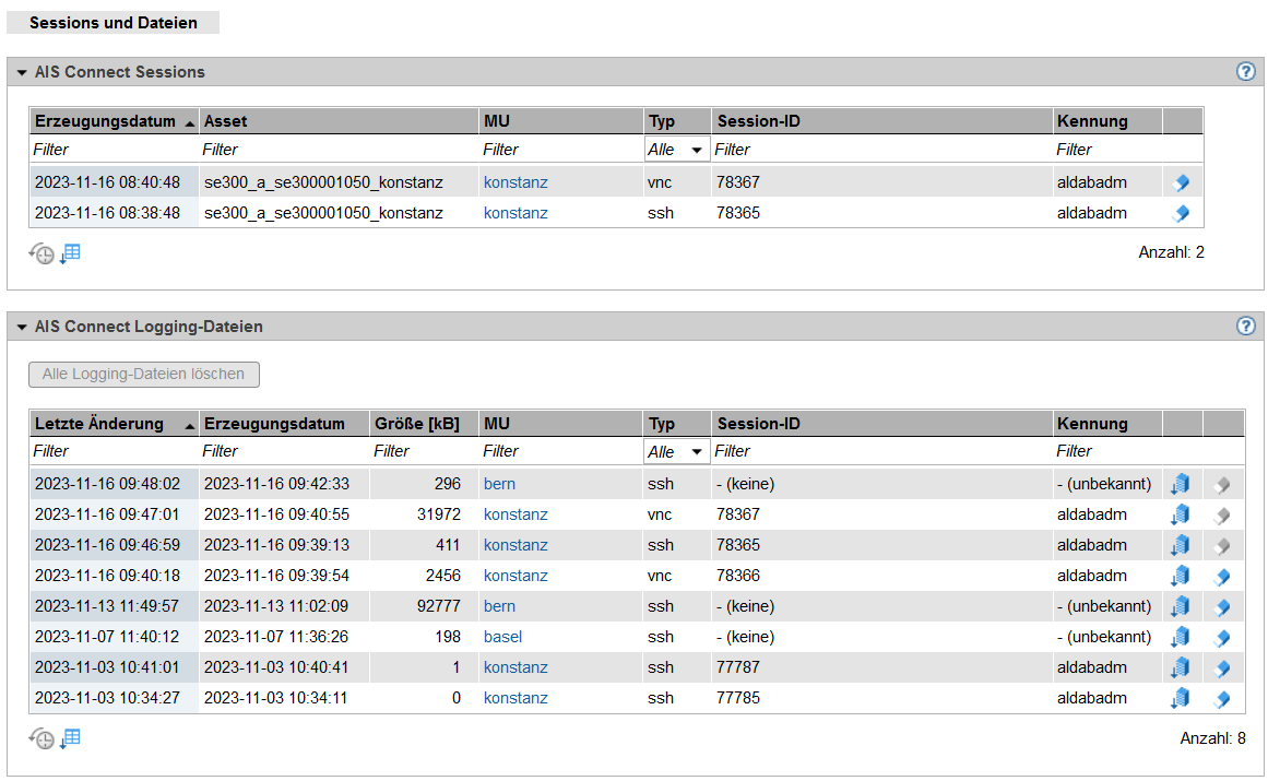 Die Registerkarte Sessions und Dateien im Menü Remote Service Sessions zeigt die aktuell aktiven AIS Connect Sessions sowie in einer zweiten Tabelle die vorhandenen AIS Connect Logging-Dateien an. Die angezeigten Informationen sind MU-übergreifend, betreffen also alle Management Units des SE-Verwaltungsbereichs.