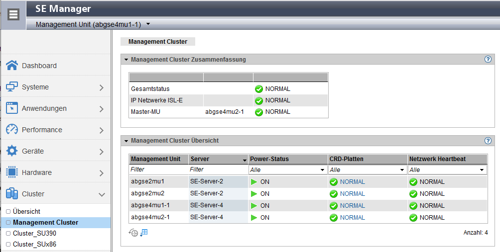 - Master-MU: Name der Management Unit, die im Management Cluster aktuell als -> Master-MU fungiert, und der Status der internen Ressourcen der Master-MU.