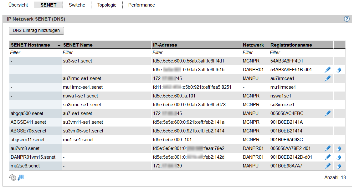 Die Registerkarte SENET zeigt alle DNS-Einträge des SENET an. Sie können zusätzlich zu den festen internen Einträgen weitere DNS-Einträge hinzufügen oder entfernen und den Hostnamen ändern: