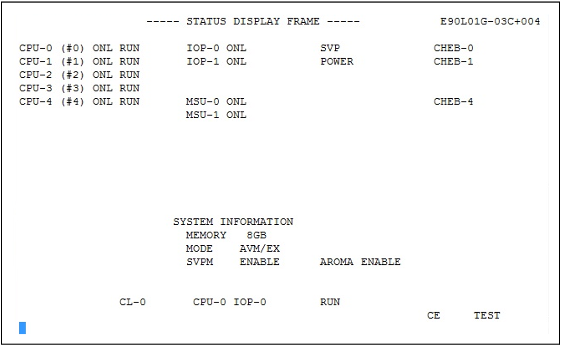 Wichtige Anzeigen sind die Speichergröße, der Adressierungs-Modus (MODE EXA oder AVM/EX) und die Verfügbarkeit der SKP-Funktionalität (Anzeige SVPM ENABLE).