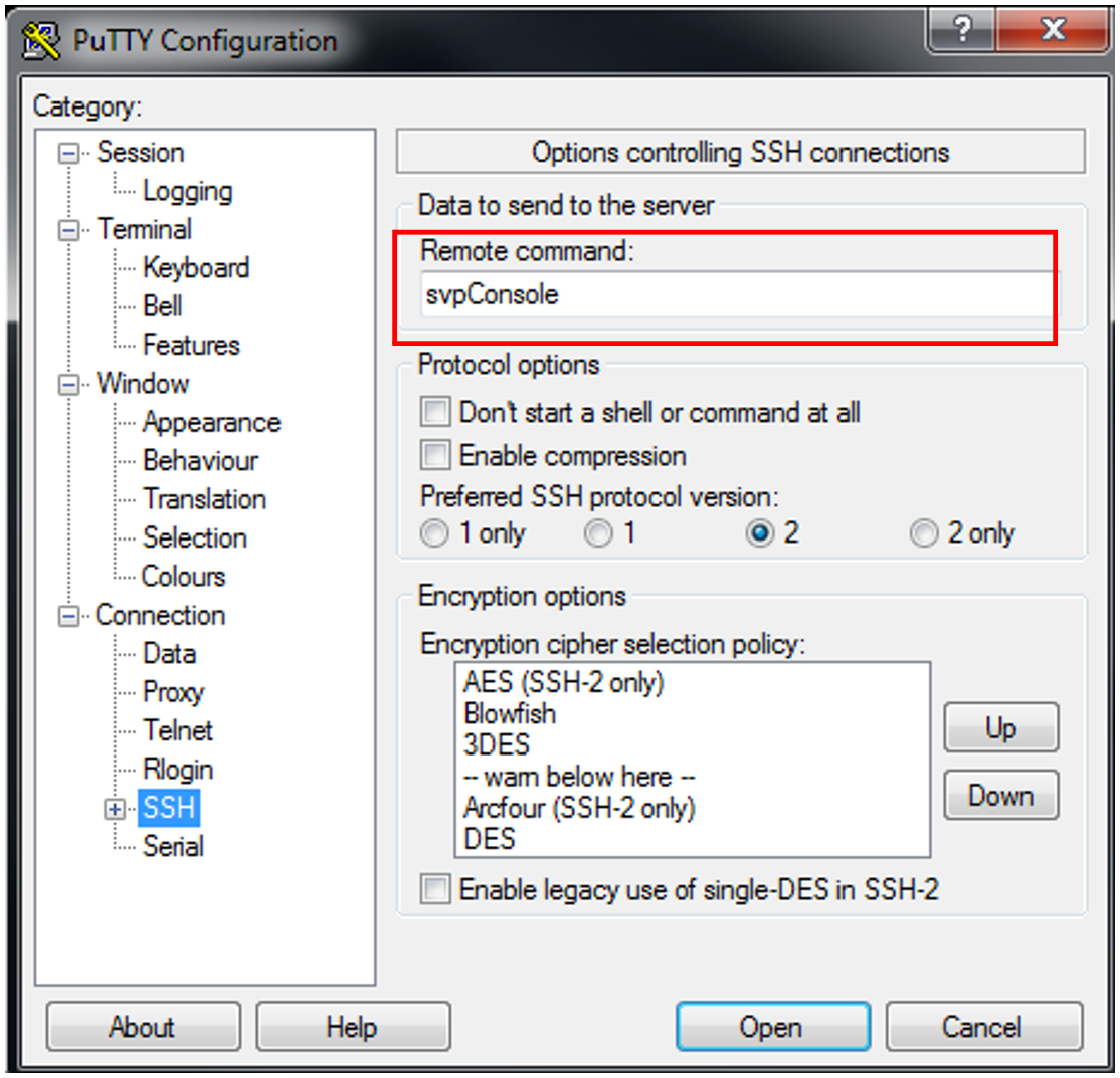 Nach erfolgreicher Anmeldung wird die Verbindung mit der SVP-Konsole geöffnet. Wichtige Tastenkombinationen sind: