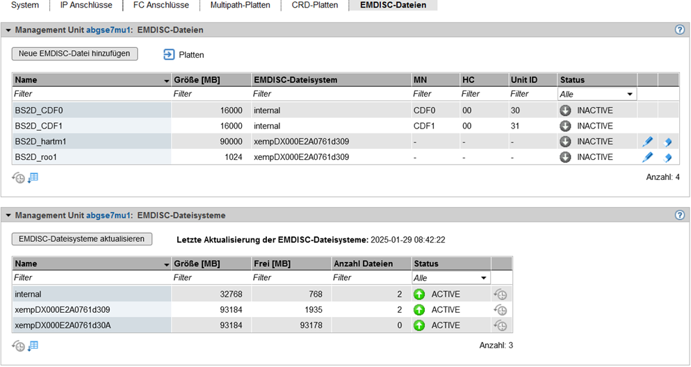 Durch Klicken auf EMDISC-Dateisysteme aktualisieren können die angezeigten Daten aktualisiert werden. Nur für berechtigte Benutzer und nur, falls das EMDISC-Dateisystem nicht schon im Zustand ACTIVE ist, steht für einzelne EMDISC-Dateisysteme außerdem die Aktion EMDISC-Dateisystem reparieren zur Verfügung.