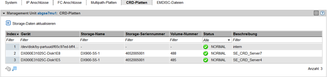 Die Tabelle zeigt die CRD-Platten mit dem aktuellen Status. Die interne CRD-Platte wird vor möglichen externen CRD-Platten angezeigt. Die Spalte Beschreibung enthält ggf. zusätzliche Informationen zur Verwendung der CRD-Platte.