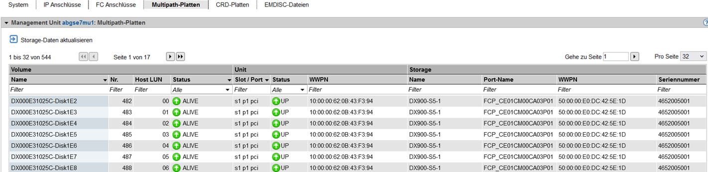 Die Registerkarte Multipath-Platten zeigt für die FC-Platten der Unit den Status ihrer Pfade von der Unit zum Storage-System und die Endpunkte der Pfade, also die Anschlüsse am Storage-System und auf der Unit, an. Name und Seriennummer des Storage-Systems sind nur versorgt, wenn STORMAN richtig konfiguriert ist und die Storage-Daten aktuell sind. Dazu muss der Dialog Storage-Daten aktualisieren im Menü Hardware -> Storage aufgerufen werden.