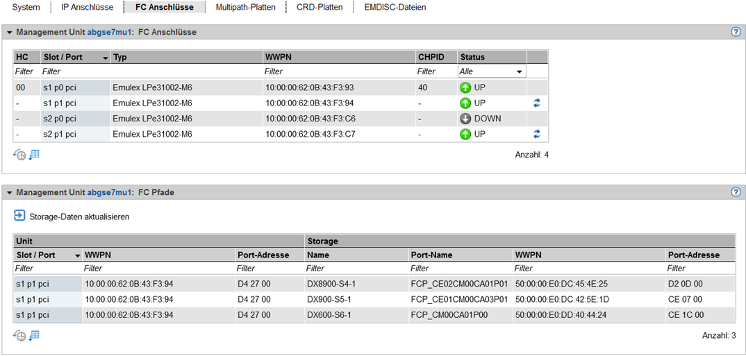 FC Anschlüsse informiert zu jedem FC Anschluss der MU über den verwendeten Host-Connector, den Steckplatz (Slot und Port), den Typ (Firmware- und Revisionstand), die lokale WWPN (World Wide Port Number) des FC Anschlusses, sowie über den Anschluss-Kanal an die Server Unit /390 (Channel Path ID - CHPID). Zusätzlich wird der HW-Status der FC-Schnittstelle (UP / DOWN) angezeigt. Für MUs ohne SKP-Funktionalität werden die Spalten HC und CHPID nicht angezeigt.