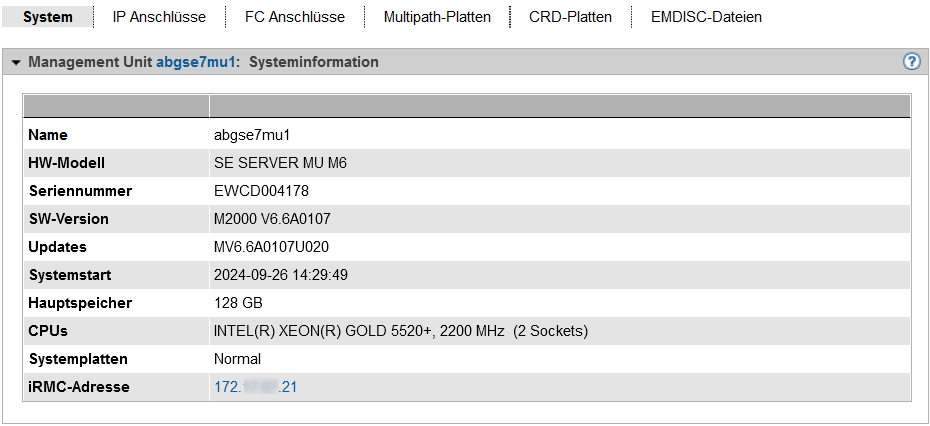 Die Registerkarte CRD-Platten im Menü Information zeigt den Status der internen und der ggf. vorhandenen externen CRD-Platten (Konfigurationsplatten) der Management Unit an.