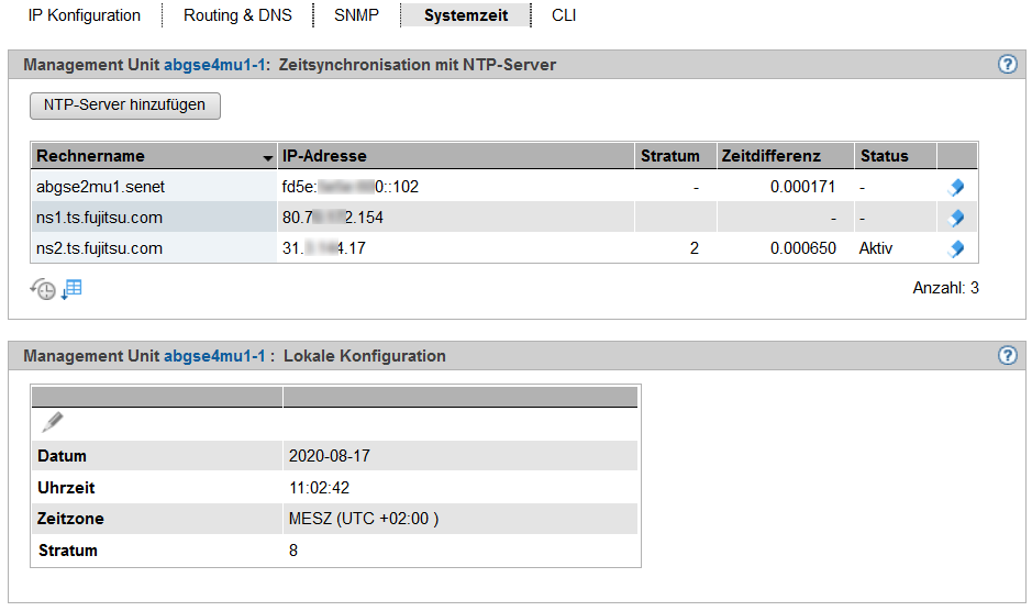 Die Registerkarte Systemzeit zeigt die NTP-Server, die für die automatische Zeitsynchronisation eingetragen sind, und die lokale Zeit der MU an.