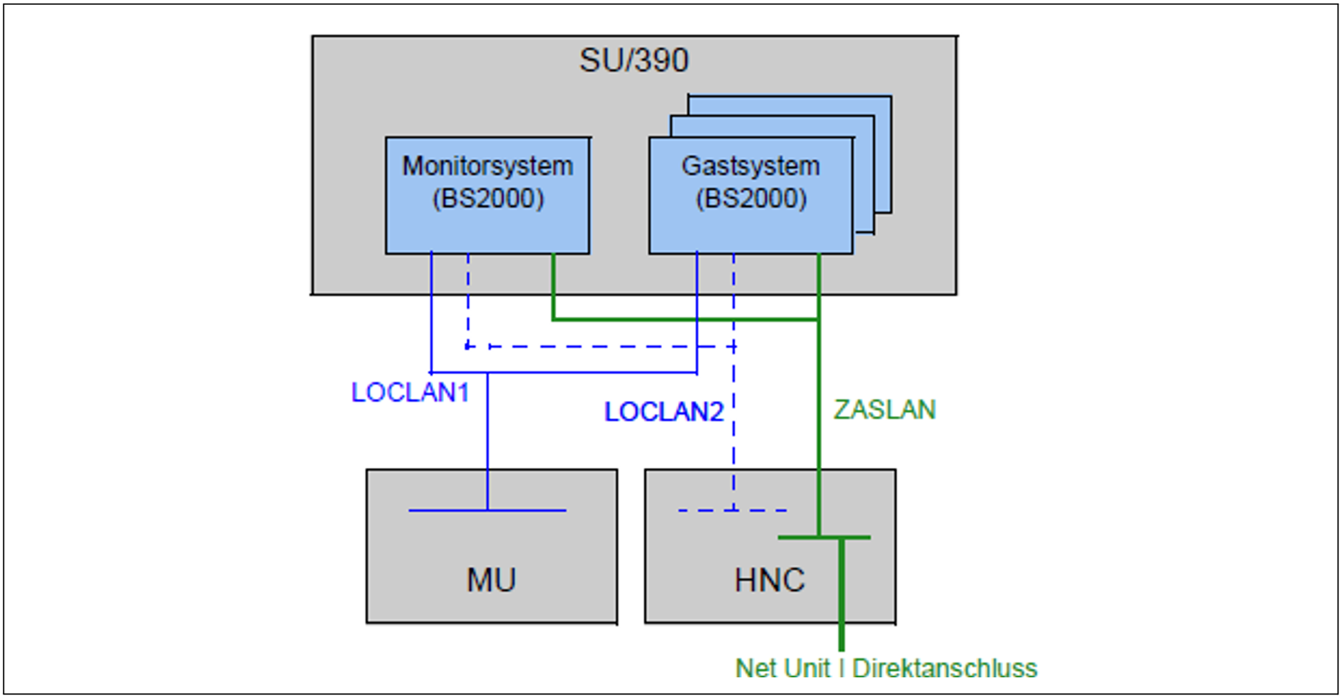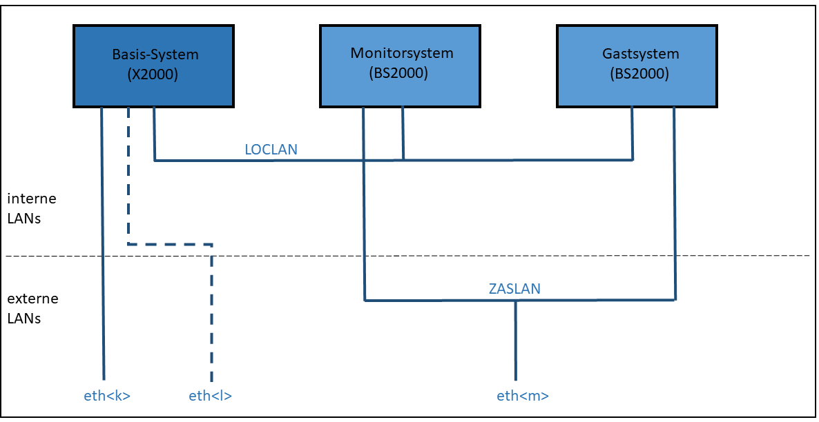 Die folgenden Grafiken geben einen Überblick möglicher interner und externer LAN-Verbindungen der auf der Server Unit laufenden BS2000-VMs. Die physikalische Netzwerkeinbindung ist in Bild 2 dargestellt.